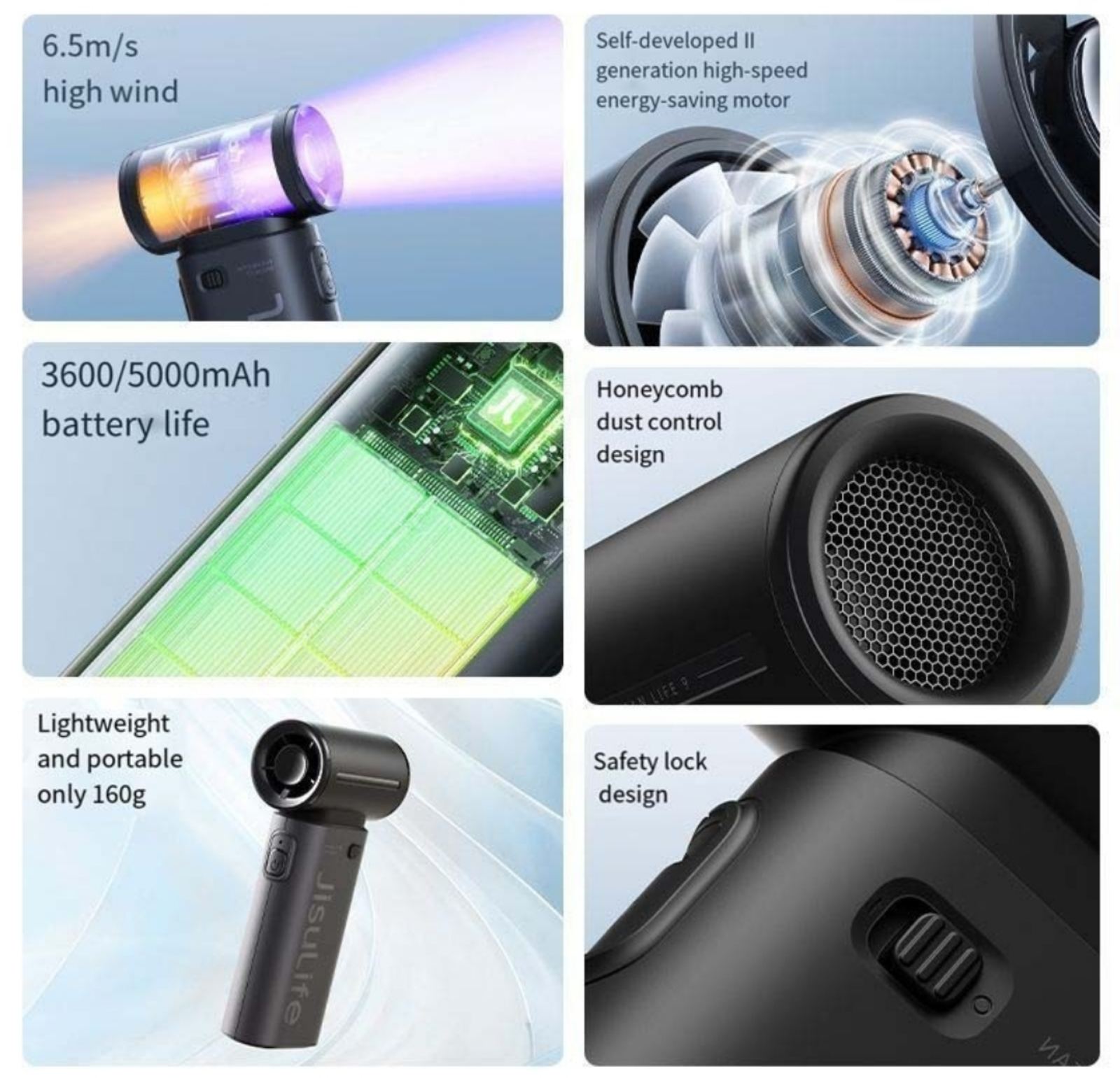 Introducing the Jisulife Handheld Fan Life9, the ultimate cooling solution for hot summer days. With a high-speed energy-efficient motor and Air Turbo Air Multiplication Technology, enjoy a super strong wind speed of 6.5m/s. The 5,000mAh battery provides up to 18 hours of runtime and 5 levels of speed, up to 6.5m/s. Stay cool with its compact size and eye-catching design.