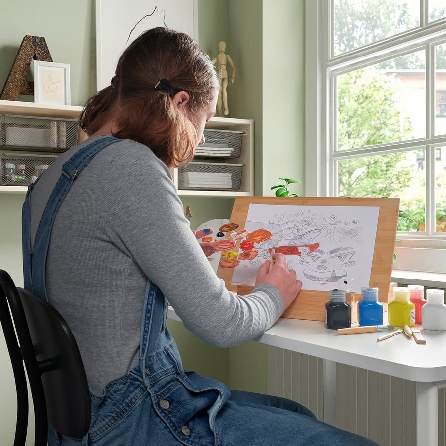 SOLFÅGEL easel is a perfect tool for everyone who wants to paint. It includes a palette and spatula, is simple to carry and has space for acrylic paints, a canvas pad and brushes under the lid.